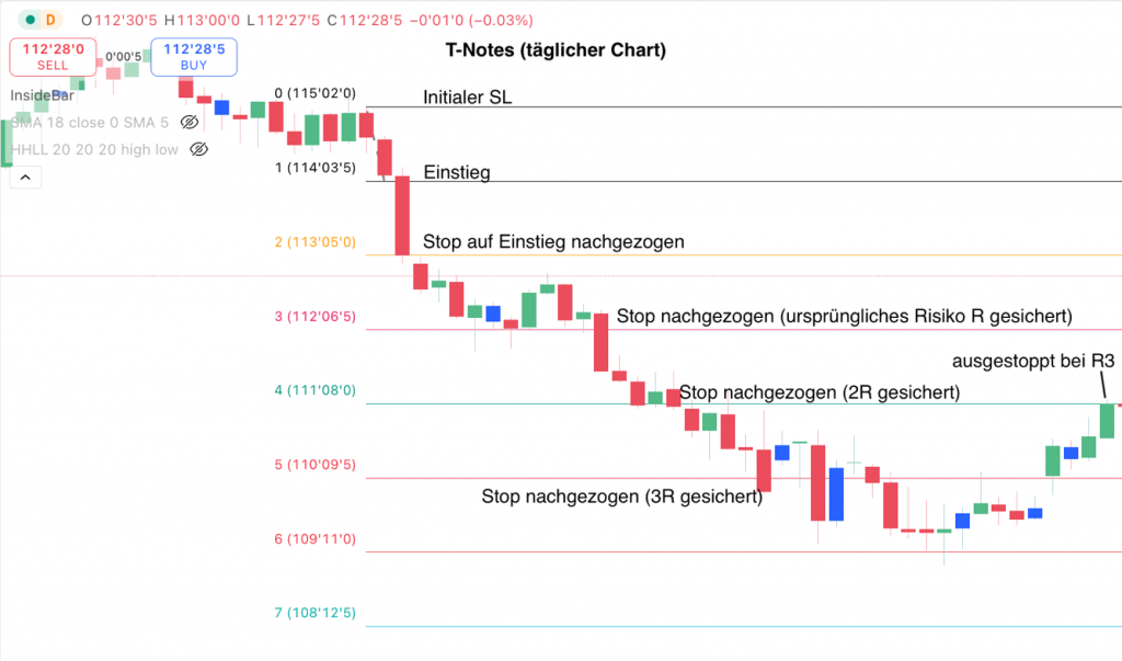 - +R2: sobald ein Gewinn in Höhe des zweifachen Risikos erreicht ist, ziehe ich den Stop-Loss nach, so dass das ursprüngliche Risiko als Gewinn gesichert wird.